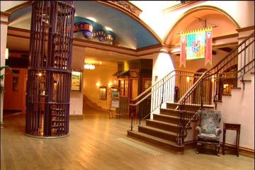 Chapter One starts with a visual tour of part of the museum interior and exterior. The interior shots were done both when the museum was closed and open, while the exterior shots were done during operating hours. Comparisons are made between the museum's architecture and the films of Studio Ghibli, including a clip from "Sprited Away", showing how the multiple bridges, levels and soaring central hall of the museum reflect the bathhouse in the movie. There are clips of Miyazaki creating the storyboards for the museum, as well as stills of those storyboards and shots of the actual interior. The Chapter ends with comments by Takahata on the museum and it's design elements and themes. |